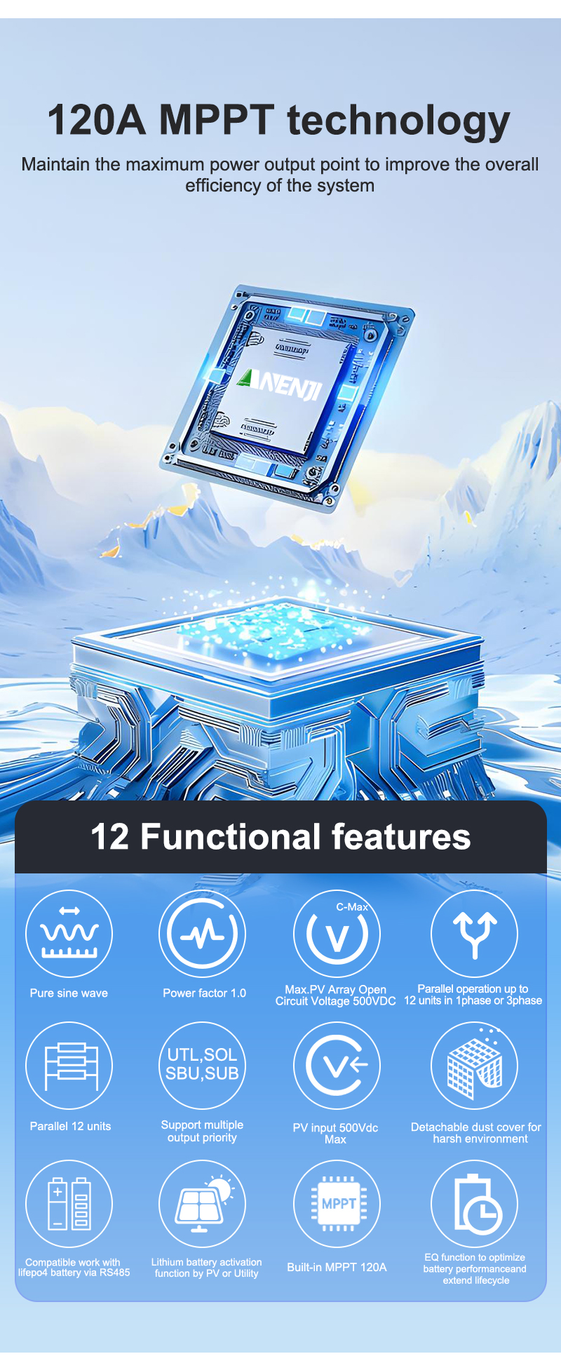 • Built-in 120A MPPT: Maximizes the efficiency of solar panels with Maximum Power Point Tracking.
