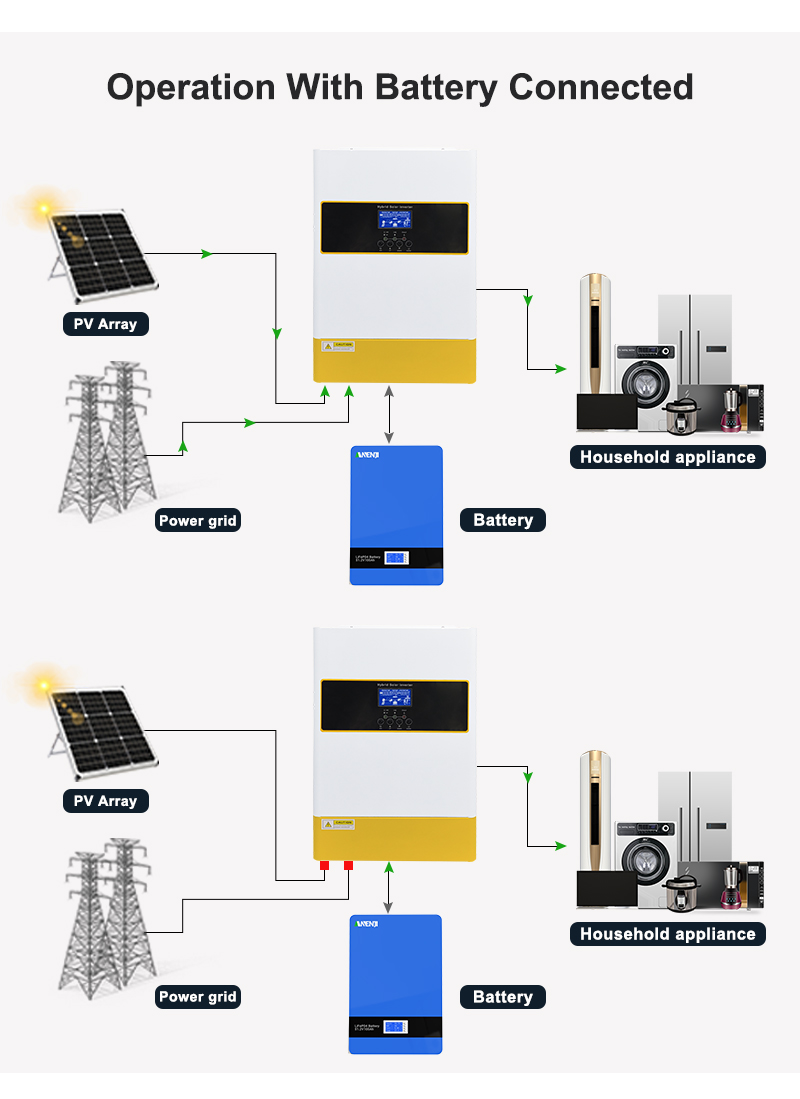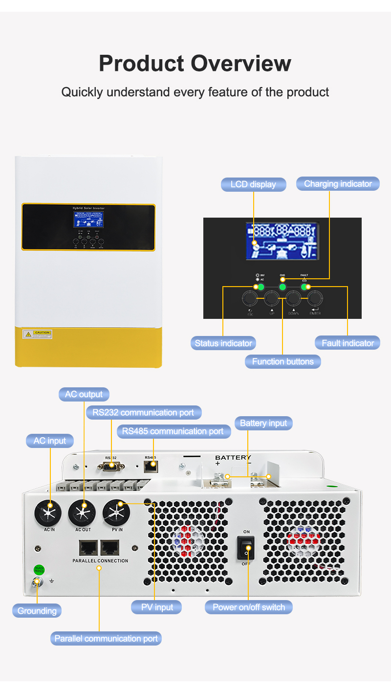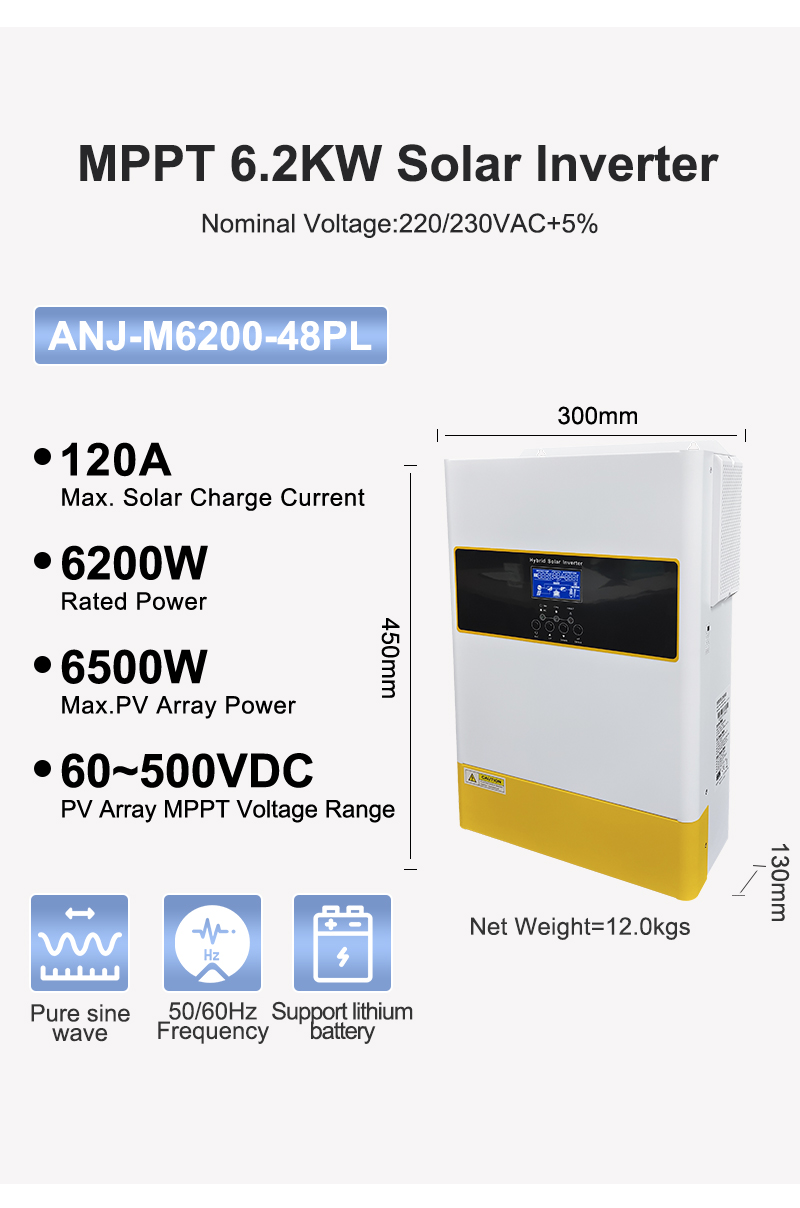 ANENJI 6.2KW 48V MPPT Hybrid Solar Inverter is a multi-function inverter/charger, combining functions of inverter, MPPT solar charger and battery charger to offer uninterruptible power support with portable size. Its comprehensive LCD display offers user-configurable and easy-accessible button operation such as battery charging current, AC/solar charger priority, and acceptable input voltage based on different applications.