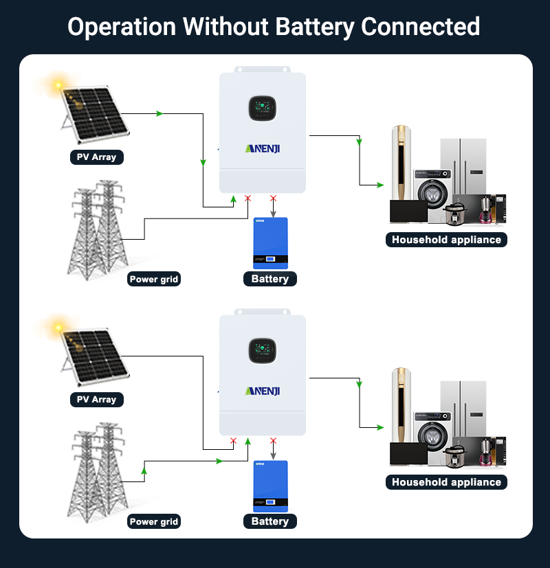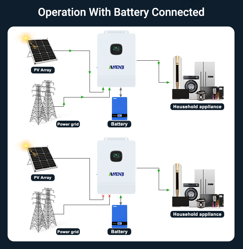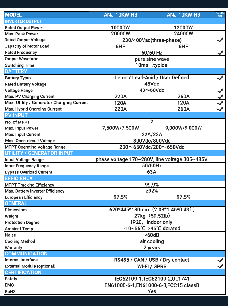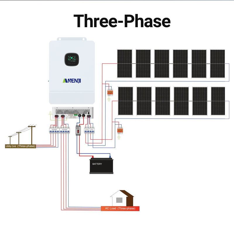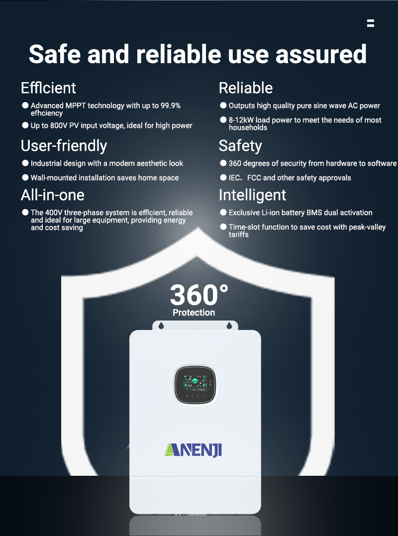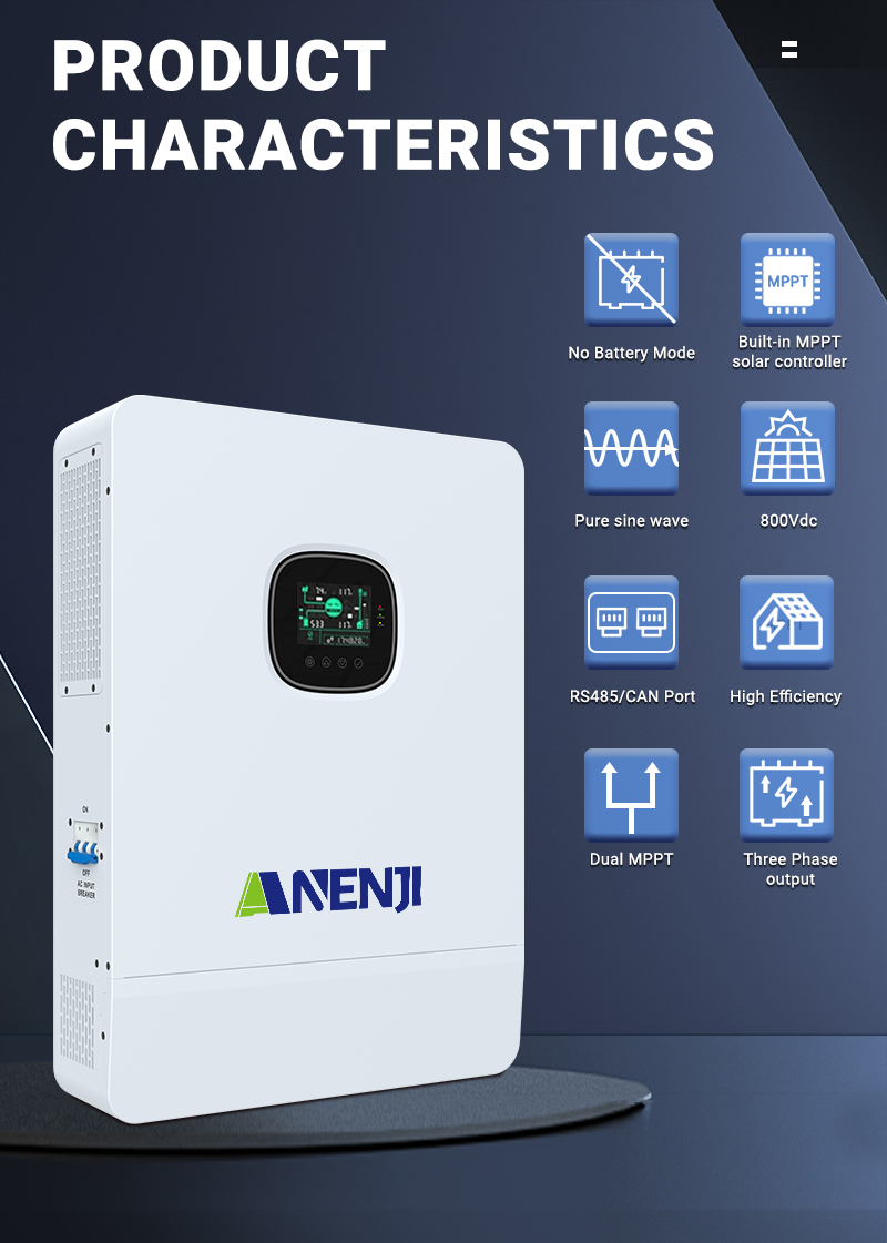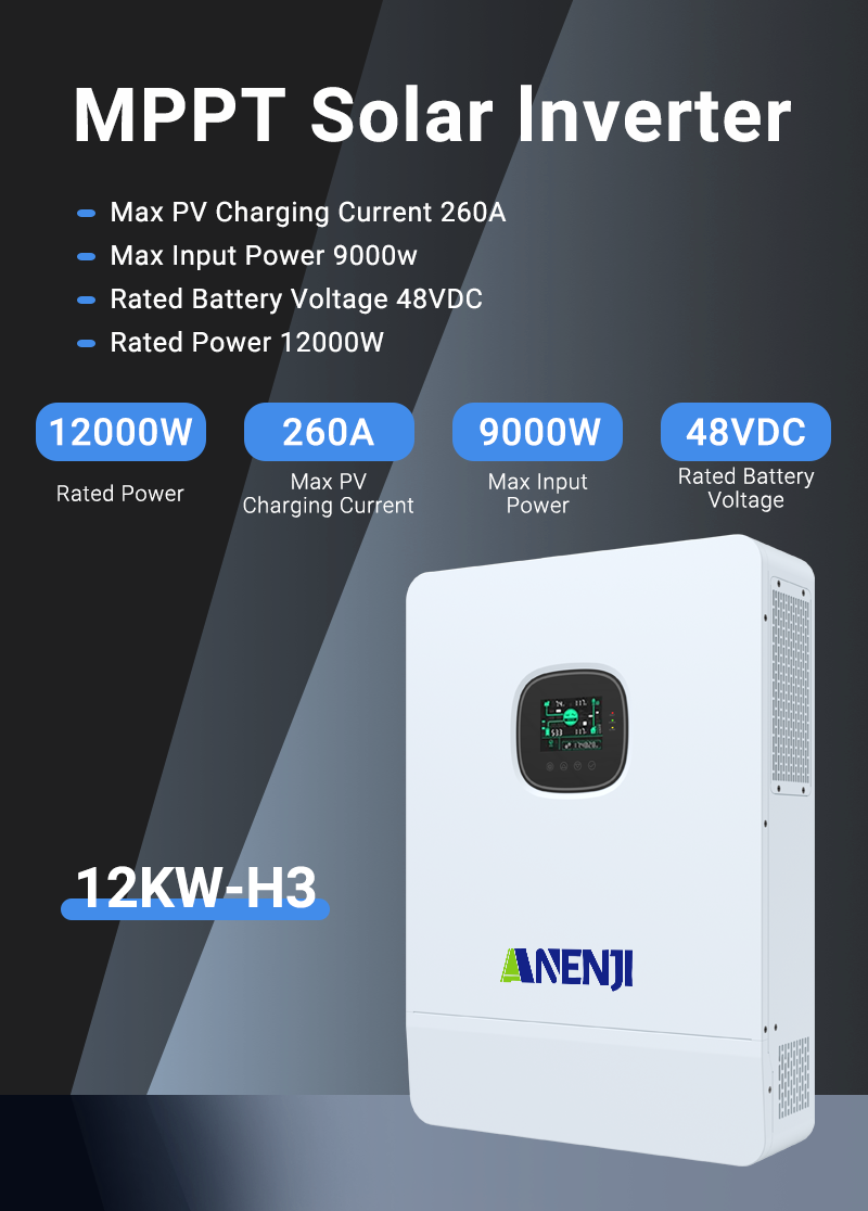ANENJI 12KW-36KW 48V 2*MPPT 3-phase solar off-grid inverter is a new type of solar storage inverter control inverter that integrates solar energy storage, utility charging energy storage, and AC sine wave output. Although high power inverters have a high initial investment, they can significantly reduce long-term energy costs. At the same time, they can provide you with enough power to meet the operational needs of energy-intensive equipment, including multiple electrical appliances, air conditioning systems, heating systems, and other energy-consuming equipment. Bringing you energy independence not only improves reliability, but also reduces electricity bills. It is controlled by DSP, and through advanced control algorithms, it is characterized by fast response time, high reliability, and compliance with industrial standards.