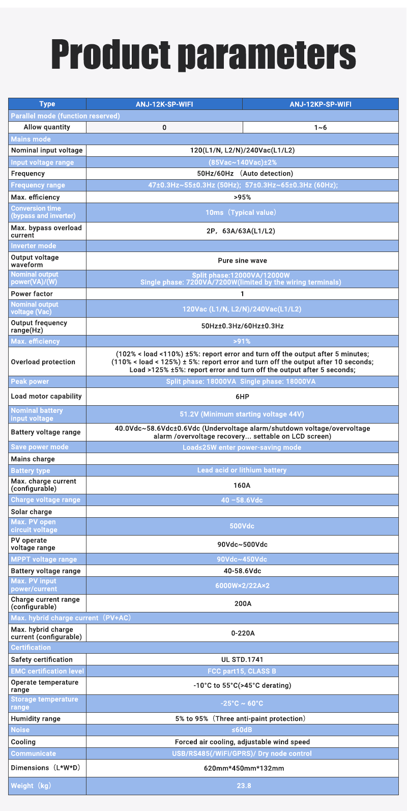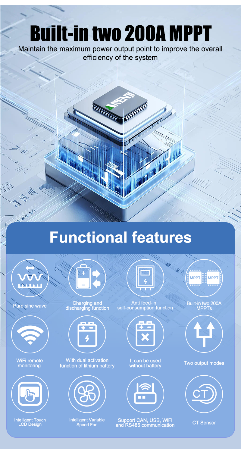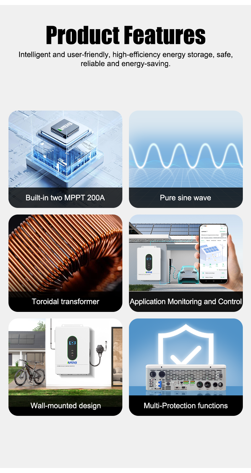 - Full digital voltage and current double closed-loop control, advanced SPWM technology, output of pure sine wave; supports split-phase and single-phase pure sine wave output; Supports four different voltage levels of 100Vac, 105Vac, 110Vac, and 120Vac per phase.