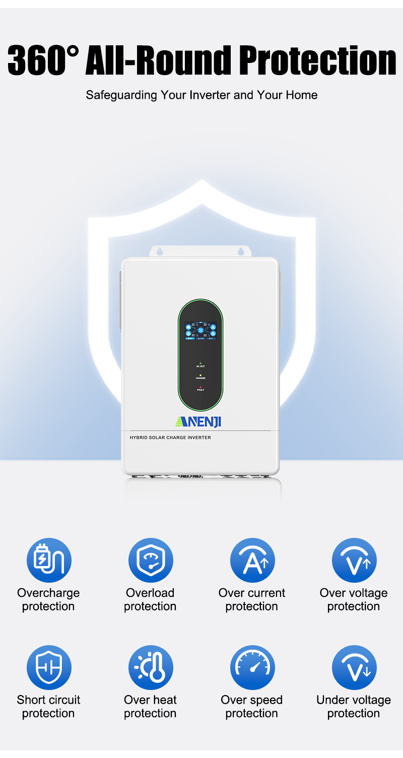 - Complete protections, including over voltage and under voltage protection, overload protection, reverse protection, etc. 360° all-round protection with a number of protection functions.