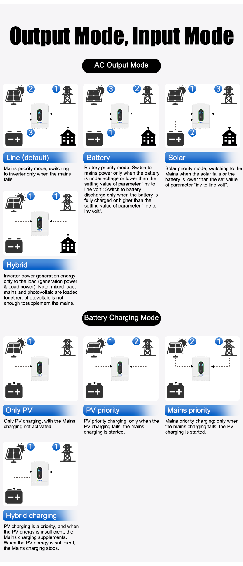 - Two output modes: mains bypass and inverter output; Uninterrupted power supply.