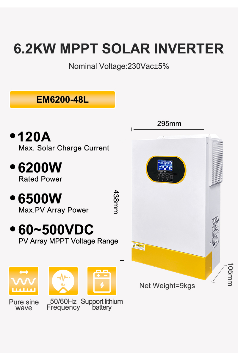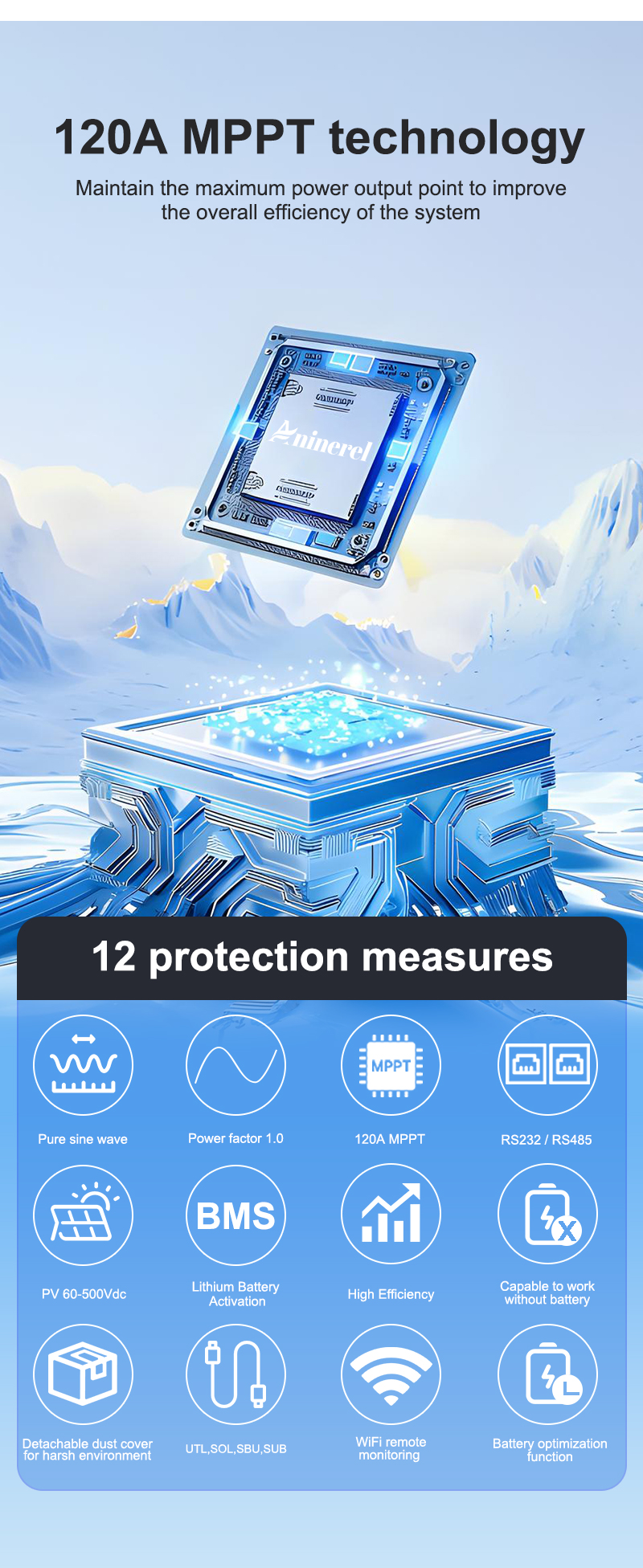 - Built-in 120A MPPT: Integrates Maximum Power Point Tracking technology to maximize the efficiency of solar panels.