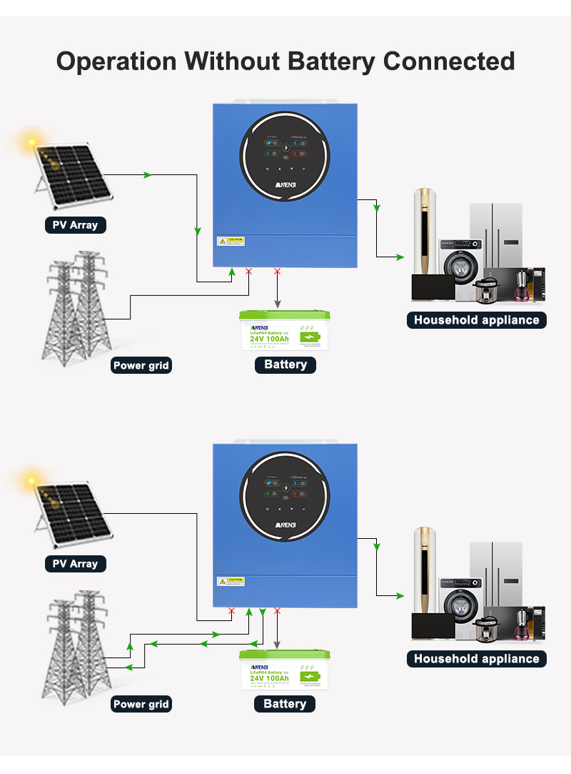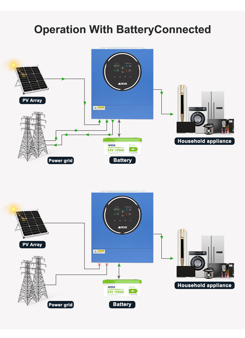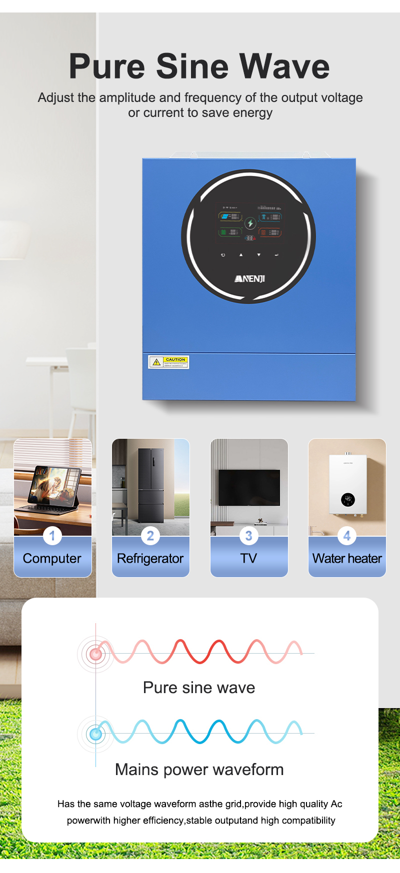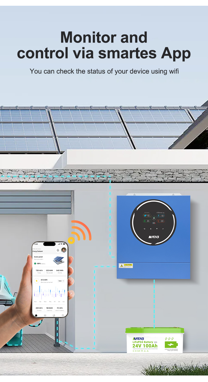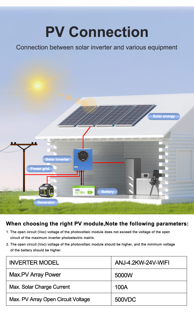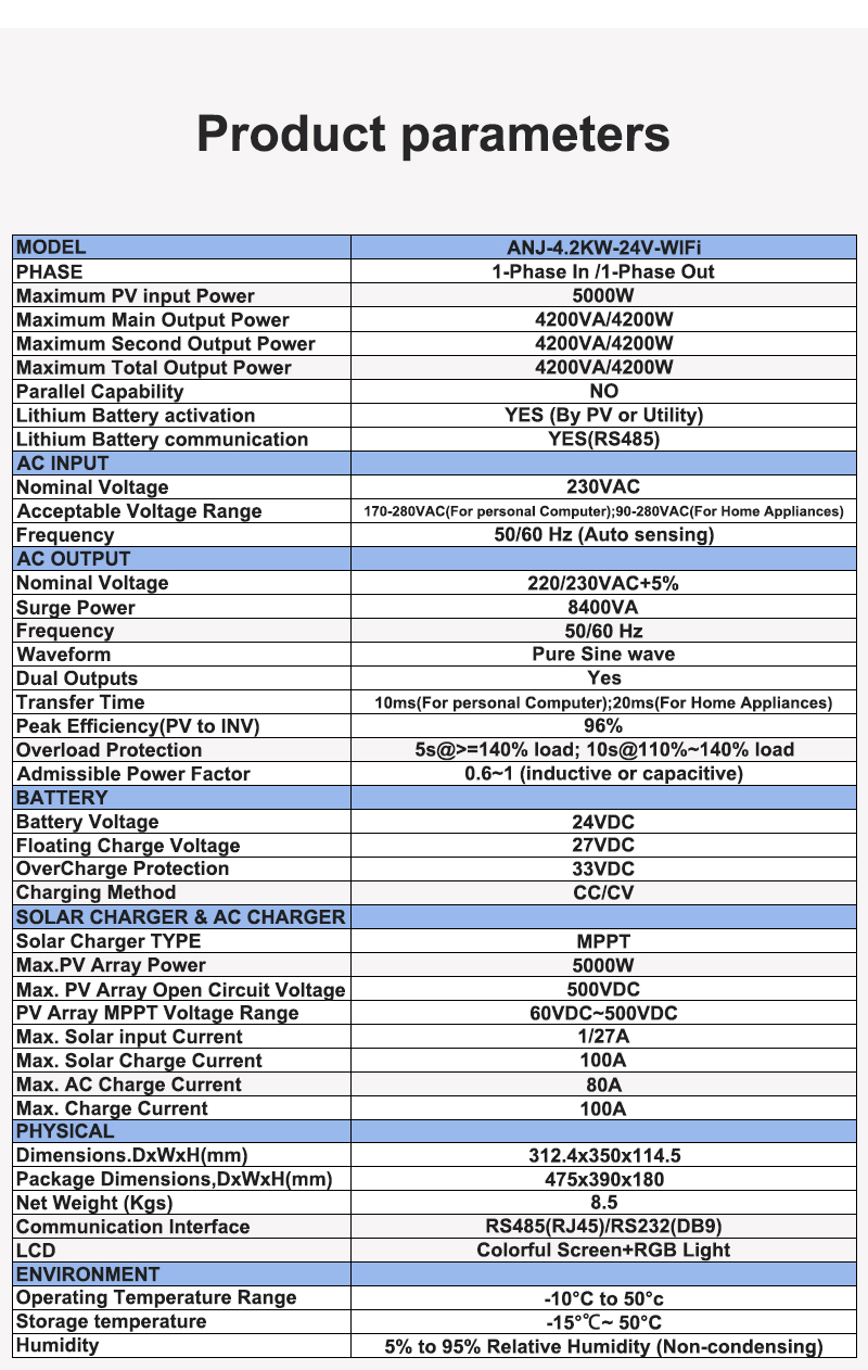 Free yourself from the high cost of electricity consumption with the most cost-effective ANENJI 4.2KW 24V hybrid Solar Inverter. This is a multi-functional inverter/charger, combining functions of inverter, solar charger and battery charger to offer uninterruptible power support in portable size. lts comprehensive LCD display offers user-configurable and easy-accessible button operation such as battery charging current, AC/solar charger priority. and acceptable input voltage based on different applications. Built-in 100A MPPT. The inverter combines advanced technology and user-friendly features to deliver reliable and efficient solar energy solutions.