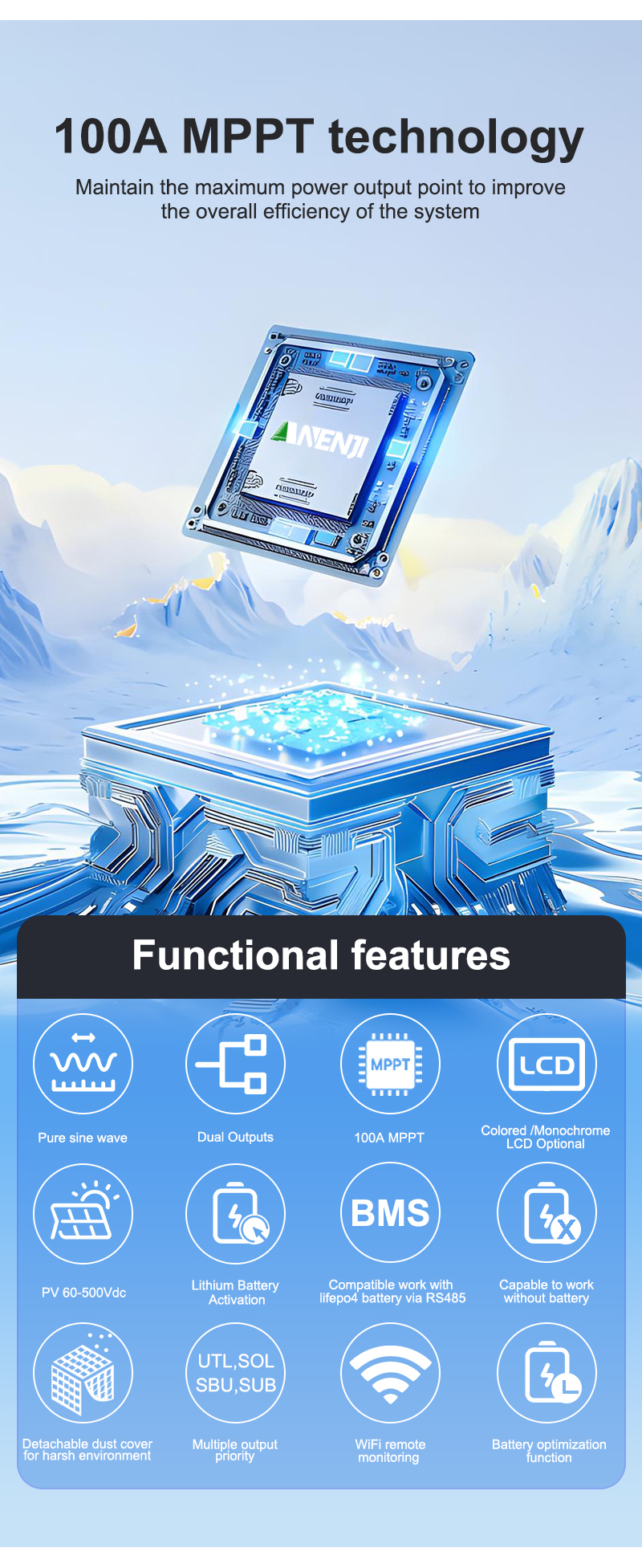 Dual outputfor smartload management Lithium battery activation function by PV or Utility Colored LcD with RGB lights Compatible work with LiFePO4 battery via RS485 PV Input 500Vdc Max Built-in MPPT100A Capable to work without battery Detachable dustcoverfor harshenvironment Built-in Wifi remote monitoring Support multiple output priority:UTL,SOL,SBU,SUB EQ function to optimize battery performance and extend lifecycle