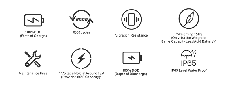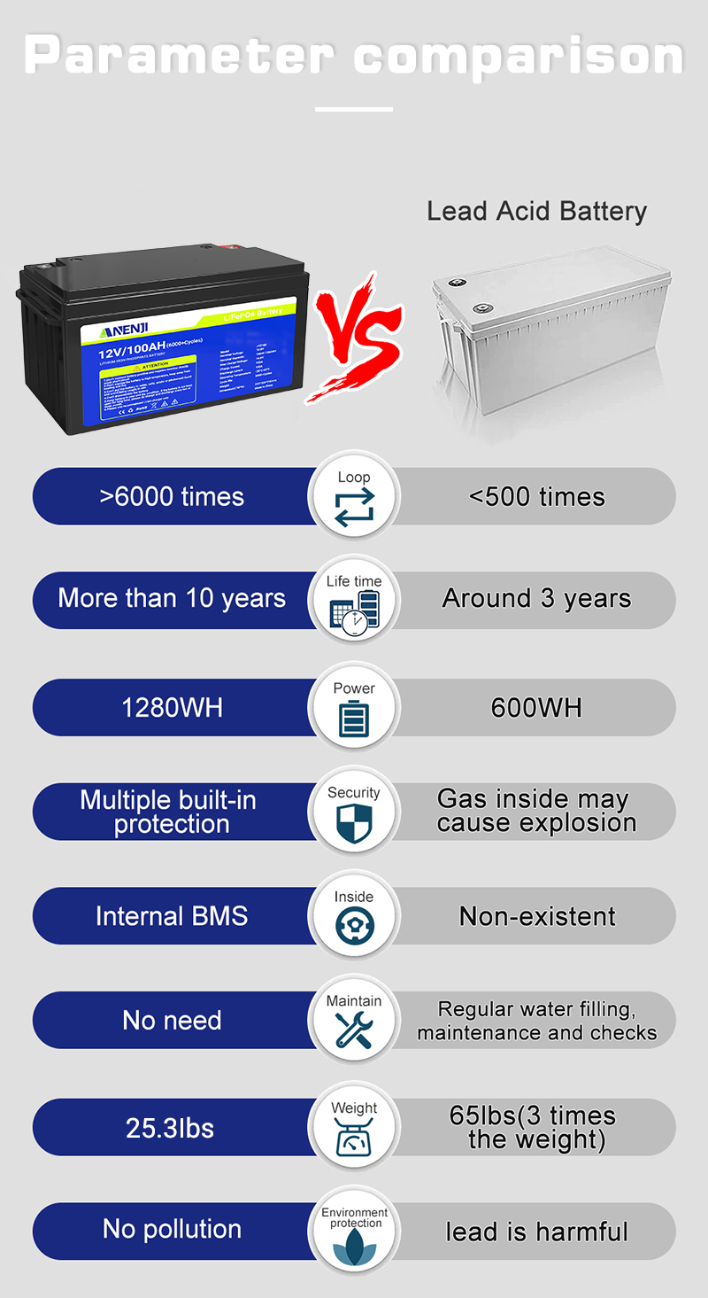 The 12V 100Ah LiFePO4 battery is known for its high energy density, long cycle life, and safety. It is widely used in solar energy storage, RVs, marine, and backup power systems. Compared to traditional lead-acid batteries, it offers a longer lifespan (over 6000 cycles), deep discharge capability, and stable power output. Its durability, efficiency, and ability to withstand deep cycling make it ideal for off-grid applications, providing a reliable and lightweight energy storage solution.