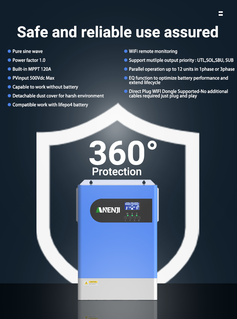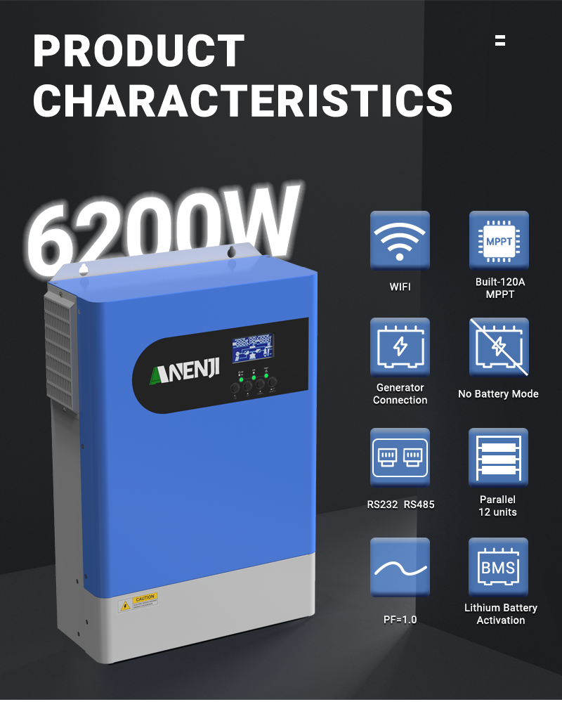ANENJI 6.2KW 48V MPPT Hybrid Solar Inverter is a multi-function inverter/charger, combining functions of inverter, MPPT solar charger and battery charger to offer uninterruptible power support with portable size. Its comprehensive LCD display offers user-configurable and easy-accessible button operation such as battery charging current, AC/solar charger priority, and acceptable input voltage based on different applications.